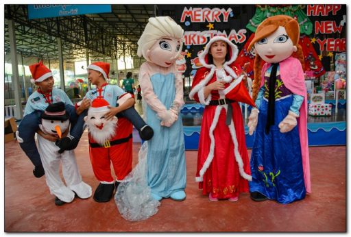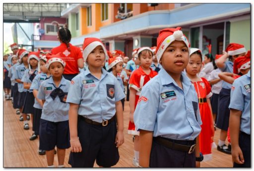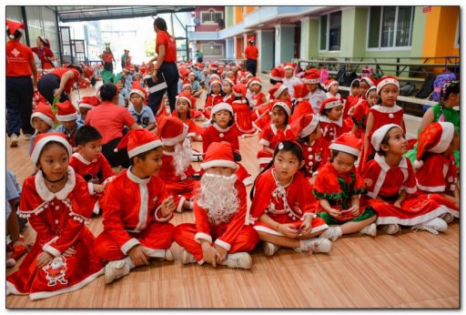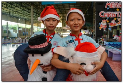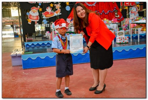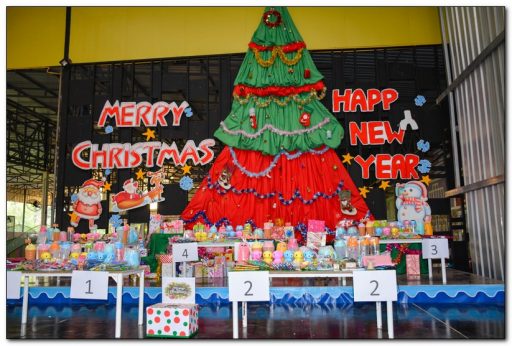 โดยมีนักเรียนแต่งกายเป็นซานตาครอสมาสร้างสีสัน พร้อมพูดว่า เมรี่คริสต์มาส ซึ่งมีความหมายว่า ขอให้พวกเราได้รับความสุขและความสงบใจ และแจกของรางวัลให้เด็กนักเรียนด้วยบรรยากาศเต็มไปด้วยความสนุกสนาน รวมทั้งการเต้นประกอบเพลง เล่นเกม เป็นการผ่อนคลายความเครียด