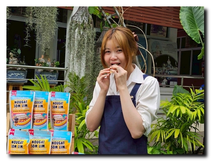 นูกัตที่เป็นแบบฉบับของเรา โดยพัฒนาส่วนผสมที่มีความเป็นไทย โดยเฉพาะท้องถิ่นของกำแพงเพชร ศูนย์บ่มเพาะผู้ประกอบการอาชีวศึกษา วิทยาลัยเทคนิคกำแพงเพชร นายยอดเพชร แพรน้อย รองผู้อำนวยการฝ่ายแผนงานและความร่วมมือ วิทยาลัยเทคนิคกำแพงเพชร นางพิมพ์สุรีย์ พงษ์เสือ หัวหน้าศูนย์บ่มเพาะผู้ประกอบการอาชีวศึกษา นางสาวเขมิสรา ศรีเสมอ คนตัวเล็กใส่แว่น ปวส.2 แผนกวิชาการตลาด นางสาวอรวรรณ ศรีประเสริฐ คนตัวสูง คนพูด ปวส.2 แผนกวิชาการตลาด นางสาวบุษรินทร์ หอมเย็น ปวส.2 แผนกวิชาการบัญชี