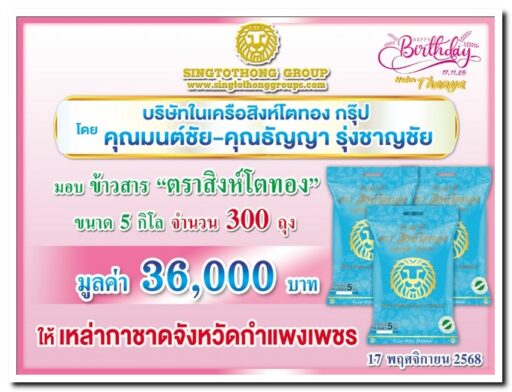 ภายหลังเสร็จสิ้นพิธีสงฆ์ คุณธัญญา รุ่งชาญชัย ยังได้ทำความดีเพื่อสังคม ด้วยการมอบข้าวสาร “ตราสิงห์โตทอง” ขนาด 5 กิโล จำนวน 300 ถุง มูลค่า 36,000 บาท ซึ่งเป็นผลิตภัณฑ์หลักของบริษัท ให้แก่ สำนักงานกาชาดจังหวัดกำแพงเพชร โดยมีนางกาญจนี รุจนเสรี นายกเหล่ากาชาดจังหวัดกำแพงเพชร พร้อมคณะรับมอบ เพื่อนำไปใช้ในการช่วยเหลือผู้ยากไร้ ผู้ด้อยโอกาส และผู้ประสบภัยในพื้นที่ต่อไป