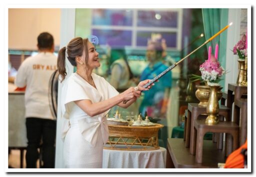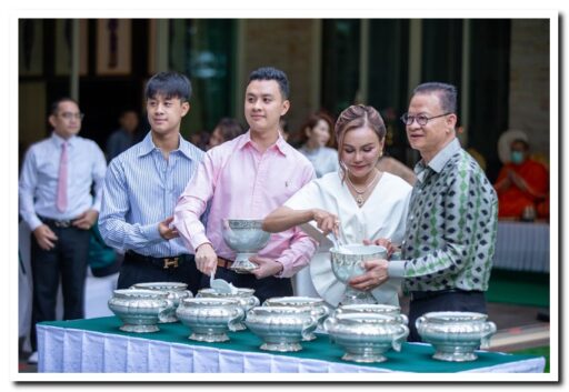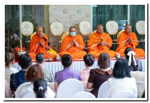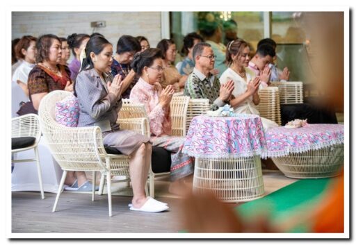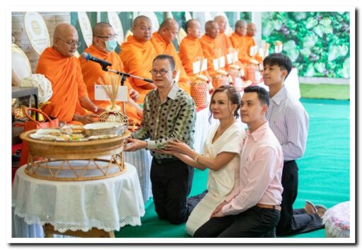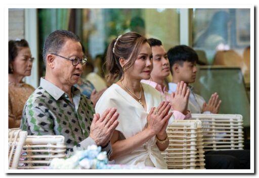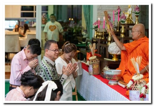 ในพิธีเป็นมงคลนี้ ได้นิมนต์พระพรหมวัชรวิสุทธิ์ เจ้าคณะภาค 4 เจ้าอาวาสวัดคูยาง (พระอารามหลวง) และพระสงฆ์มาเจริญพระพุทธมนต์ เพื่อความเป็นสิริมงคลแก่ตนเองและครอบครัวและความตั้งใจในการทำบุญ ทั้งการร่วมกันใส่บาตรและถวายภัตตาหารแด่พระสงฆ์
