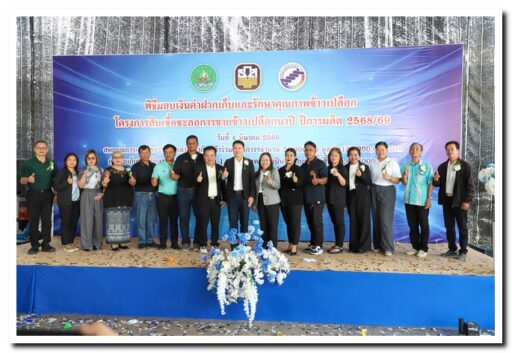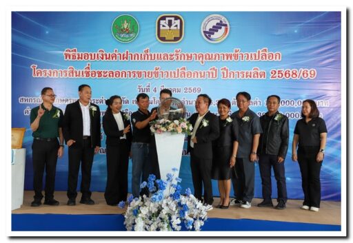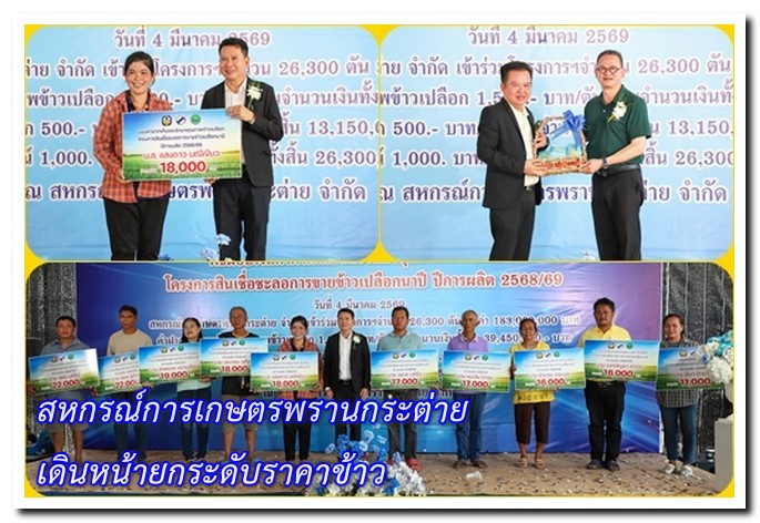 สหกรณ์การเกษตรพรานกระต่าย จำกัด ต.ถ้ำกระต่ายทอง อ.พรานกระต่าย จ.กำแพงเพชร นายสดุดี พุทธัง ปลัดจังหวัดกำแพงเพชร เป็นประธานในพิธีมอบค่าฝากเก็บและรักษาคุณภาพข้าวเปลือก ตามโครงการสินเชื่อชะลอการขายข้าวเปลือกนาปี ปีการผลิต 2568/69 โดยมีนายเศกสันต์ สารการ นายอำเภอพรานกระต่าย, นางสาวมณฑาทิพย์ บัวเทศ สหกรณ์จังหวัดกำแพงเพชร, นายอนันต์ โฆษิตพิพัฒน์ เกษตรและสหกรณ์จังหวัดกำแพงเพชร, นายสุทัศน์ ฟองคำ ผู้อำนวยการสำนักงาน ธ.ก.ส. จังหวัดกำแพงเพชร, นางรุจิเรข เธียรไทย ผู้จัดการธกส.สาขาพรานกระต่าย และนายมนต์ชัย รุ่งชาญชัย ประธานบริษัทโรงสีสิงห์โตทองไร้ซ์ จำกัด พร้อมด้วยหัวหน้าส่วนราชการร่วมเป็นเกียรติและสักขีพยานในพิธี