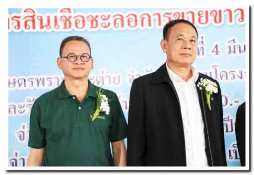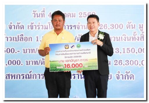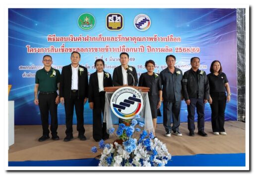 บรรยากาศภายในพิธีมอบเงินค่าฝากเก็บและรักษาคุณภาพข้าวเปลือก ตามโครงการสินเชื่อชะลอการขายข้าวเปลือกนาปี เป็นไปอย่างคึกคัก นายมนต์ชัย รุ่งชาญชัย ประธานบริษัท โรงสีสิงห์โตทองไร้ซ์ จำกัด ได้ให้เกียรติเข้าร่วมงานเพื่อแสดงความยินดีกับกลุ่มเกษตรกรที่ได้รับเงินช่วยเหลือ ซึ่งเป็นกลไกสำคัญในการช่วยยกระดับราคาข้าวและสร้างความมั่นคงทางรายได้ให้กับชาวนาในช่วงฤดูกาลผลิตนี้